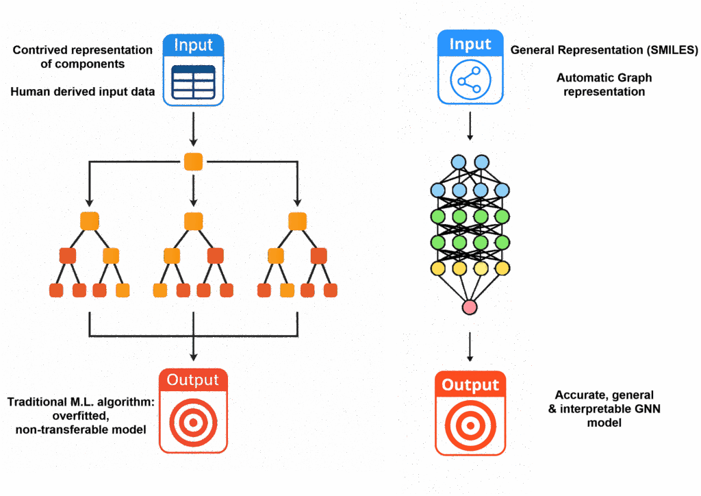 This ease of modification in a relatively undeveloped area of asymmetric catalysis provided the perfect opportunity to explore the use of machine learning to accelerate ligand design. Writing in iScience, Aguilar-Bejarano et al present a Homogeneous Catalyst Graph Neutral Network (HCat-GNet), just such a machine learning model for aiding ligand optimisation. Usually this process is extremely time-consuming, involving the cyclic process of hypothesising changes to activity through structural changes, synthesis, testing followed by revaluation of the ligand performance.