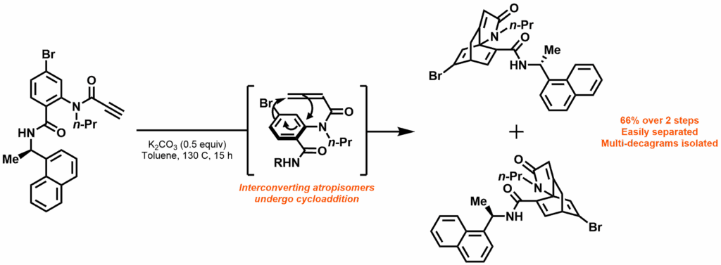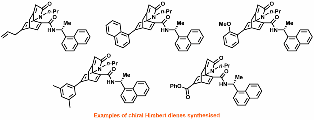 In this work by Rit et al, reported in Advanced Synthesis & Catalysis, the Himbert cycloaddition was recognised as a route to the core structure of many chiral diene ligands. The reaction dearomatises benzene through an intramolecular Diels-Alder reaction with a pendant allenecarboxanilide. By introducing a chiral auxiliary, this reaction was exploited to produce easily separable pseudoenantiomers in multi-decagram quantities. Using a bromobenzene starting material produces alkenyl bromide products; allowing these “Himbert diene” ligands to be further functionalised through palladium catalysis and consequently providing access to a wide range of novel diene ligands.