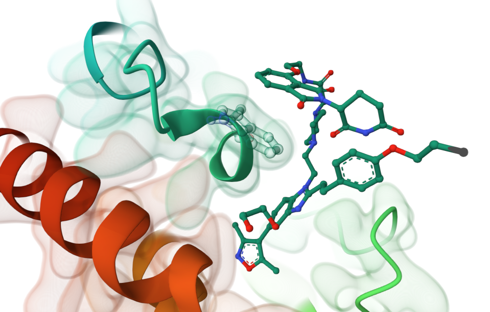 The c-Myc oncoprotein is a transcription factor implicated in more than 70% of cancers and is considered a good therapeutic target for treatments. However this is hindered by a lack of binding site for potential drug molecules, so approaches often focus on upstream proteins such as BRD4 and IRF4. In the case of IRF4, its long half-life means that even when expression of IRF4 is reduced through inhibition of the CBP/EP300 complex, protein levels are not significantly reduced. With this in mind, the authors thought a degrader approach might be effective: particularly as PROTACs are known to reduce protein concentrations long after the degrader itself has become undetectable. The fact that BRD4 and CBP/EP300 both contain bromodomains, also means such a degrader might show synergistic effects. By using ISOX-DUAL, a known μM inhibitor of both proteins, as the basis of the targeting ligand it could result in more effective reduction of c-Myc levels.